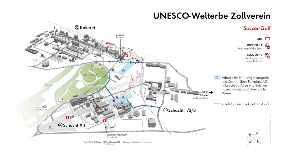 Ziel des Spiels ist, einen Fußball mit möglichst wenigen Schüssen durch einen Parcours mit neun Toren zu bringen. Ausgangspunkt ist der Infopunkt am Parkplatz A2. Dort können Besucher:innen samstags, sonntags und an Feiertagen sowie in den NRW-Ferien täglich zwischen 11:00 und 17:00 Uhr Fußbälle und Score-Cards gegen Pfand ausleihen. Von der Zeche bis zur Kokerei führt die Spielstrecke mitten durch die besondere Architektur und Industrienatur des Welterbes.